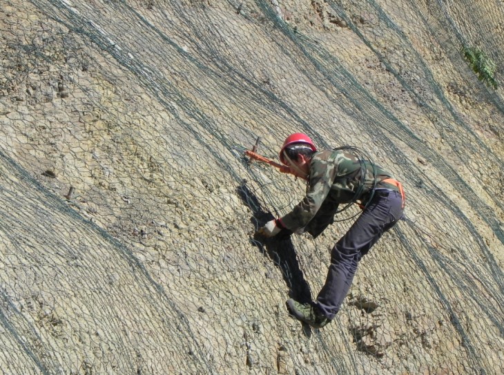 主动防护系统是以钢丝绳网为主的各类柔性网覆盖包裹在所需防护斜坡或岩石上,以限制坡面岩石土体的风化剥落或破坏以及为岩崩塌(加固作用),或将落石控制于一定范围内运动(围护作用)。