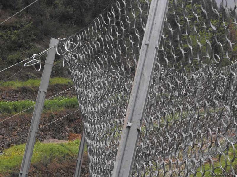 材质:钢丝绳网、支撑绳和减压环构造:由钢丝绳网或环形网(需拦截小块落石时附加一层铁丝格栅)、固定系统(锚杆、拦锚绳、基座和支撑绳)、减压环和钢柱四个主要部分构成。