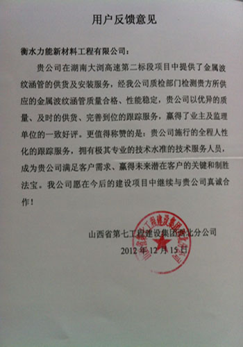 贵公司在湖南大浏高速第二标段项目中提供了金属波纹涵管的供货及安装服务,经我公司质检部门检测贵方所供应的金属波纹涵管质量合格,性能稳定,贵公司以优异的质量,及时的供货,完善到位的跟踪服务,赢得了业主及监理单位的一致好评。更值得称赞的是:贵公司施行的全程人性化的跟踪服务,拥有极其专业的技术水准的技术服务人员,成为贵公司满足客户需求,赢得未来潜在客户的关键和制胜法宝。我公司愿在今后的建设项目中继续与贵公司真诚合作!