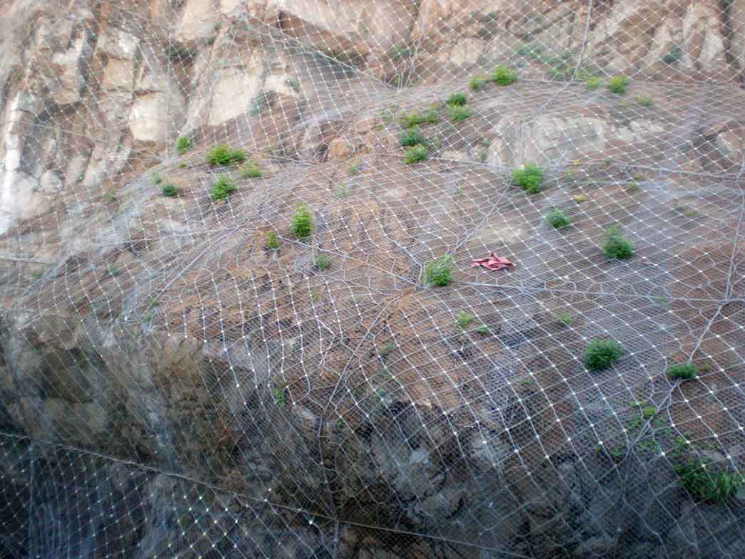 柔性钢丝绳网是现最新山坡落石防护设施,柔性钢丝绳网防护系统与传统的钢性边坡防护设施相比,柔性防护网系统更为安全可靠。整个防护系统由钢丝绳网、钢丝绳锚杆及其它附件组合安装而成,极大的提高了防护等级。且柔性钢丝绳网采用模块化的安装方式,无需大规模开挖和大量材料的转运可远离建筑和人群施工,克服了钢性防护网在施工中的诸多弊端缩短了工程施工时间和人工的工作量。