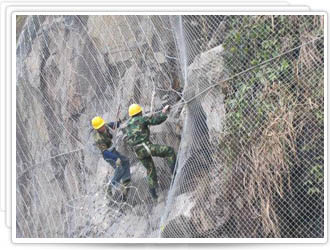 通过钢筋(可施加预应力)和/或钢丝绳锚杆(有边沿支撑绳时采用)、专用锚垫板以及必要时的边沿支撑绳等固定方式,将作为系统主要构成的柔性防护网覆盖在有潜在地质灾害的坡面上,从而实现其防护目的。适用于具有溜坍、崩塌、浅层滑动、危岩落石等潜在地质灾害的土质或岩石边坡加固和防护 。主要构成锚 杆:一般采用一端(外露段)带加工螺纹的Φ25/28普通螺纹钢筋锚杆,也可采用Φ25精轧螺纹钢筋(如GEWI锚杆),并根据需要进行热镀锌防腐处理,成孔困难时可采用自进式中空锚杆;