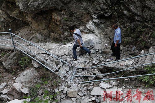 一双红色的男士运动鞋,躺在碎石块中,眼镜、相机、零食散落一地。出事景点的山道下,已树立了一个木制的牌子,“前方施工,禁止通行。”并派人员把守,阻止游客进入。 ■“碎石如雨点一般坠落” 昨日下午,记者在医院见到了多名伤者,他们都是河北师范大学职业技术学院与河北经贸大学的学生。头上缠着绷带的石海还沉浸在惊恐中,他告诉记者,悲剧发生时,他正要通过一座小桥。 “一声巨响,碎石如雨点一样,从山上飞落下来”,他说,好多人瞬间被碎石砸中。这一过程大约持续了六七秒钟,之后山路上腾起一片烟尘。 在石海亮身后大约20米,处于安全地带的房明宇目睹了这一过程,时间是11时30分许,“抬头一看,路左侧山顶有一块巨石正滚落下来,巨石又砸到山壁上,碎成了小块向下飞溅。” ■轮流背着同学走了30分钟 房明宇回忆说,突如其来的变故,让他迟愣了几秒钟。直到听到有人喊,“快去救受伤的人。” 他和班里十几个男生立马迎了上去。“一名女生浑身是血,另一名胳膊受伤的男生扶着她,边往下走边喊救命。”房明宇说,他小跑着过去,背起这个女生就往山下的医务室走。房明宇不敢走得太快,与同学李江浩交替着背了30多分钟,把她送到了景区的医务室。 一个在小桥上拍照的游客,被石头砸中头部,直接掉到了桥下的溪水里。陈振阳、赵二松、张强、高猛四个同学,赶过去后,直接跳入水中,把那个男生抬到了岸边。但由于伤势过重,该男生不久死亡。 随后,受伤的学生们,被先后送往医院。 ■景区称 滚石与下雨有关 王习杰称,此次景区的山顶滚落石块,与5月11日的下雨有关。“我们经常派人员对松动的石头进行检查,一旦松动,就会及时处理。”王习杰说,“但有些地方太高,人根本够不着。” 据了解,在事故中死亡的男孩,为河北经贸大学的学生。目前,景区与灵寿县旅游局都在积极处理善后事宜。